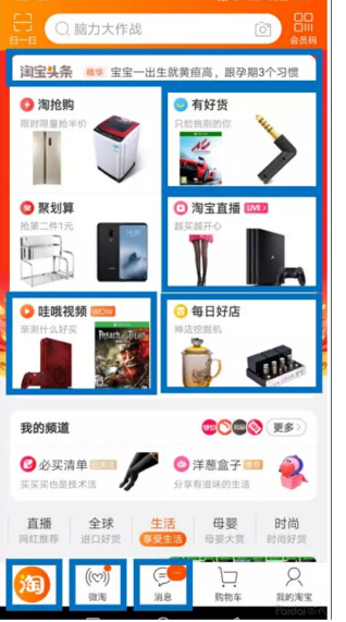 这两年,电商领域最火的词一定是“内容营销”了。提到内容化,还是先提一下网红电商。2016年网红开始火,那时有颜值的或者能东北二人转式搞笑的都能红;2017年要有一定特色的才艺展示的才能红;2018年要有真正持续产出内容的才能红。特别是走过2018年到了2019年,网红要想变现,拥有持续产出内容的能力是基本能力。网红,多数只能红极一时,网在继续,红却并不能继续。不同时期有不同时期的网红。我们现在在心里想一下,三年前的网红是谁?一般来讲我们是记不起的。就算记得起名字,在今天那个网红也已经不红了。所有的品牌都是需要时间积累的,我们之所以能记住一些影视明星,这些人还能持续红,一般都是他们有代表性的影视作品并且每年还在不断地反复轮播或者还有新的作品上市。什么是内容?就好比是明星的影视作品,只有经典的影视作品才能深入人心,影响人们的心智。那么电商的内容化,就是要把产品或者品牌的调性、风格做成专业、好玩、有趣、有灵魂,呈现这些的具体过程就是内容化。表现形式可以是文字、图片、短视频、直播、VR/AR等。我们来看一下平台的布局:下图是手机淘宝的首页,蓝色框所在的模块全都是内容板块。内容板块所占首页篇幅之大,一目了然。足可见,内容化是平台的主要方向。大品牌商家应该想办法通过内容让消费者更多维度的喜欢和追随。中小商家也应该重视内容,至少让某一类消费者爱上你,可以很幽默、很搞笑、很好玩、很逗比、很小众、很有才,这些皆内容。