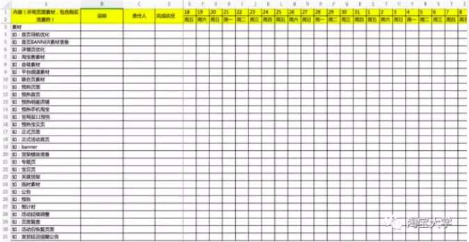 视觉还需要依据官方活动节点完成相关的页面和图片制作,并且要提前准备,提前测试,做到高效,及时。当然,为了更好地完成视觉工作,建议店铺视觉要把相关的工作任务罗列成如下图所示的工作进度清单表出来,方便及时推进。